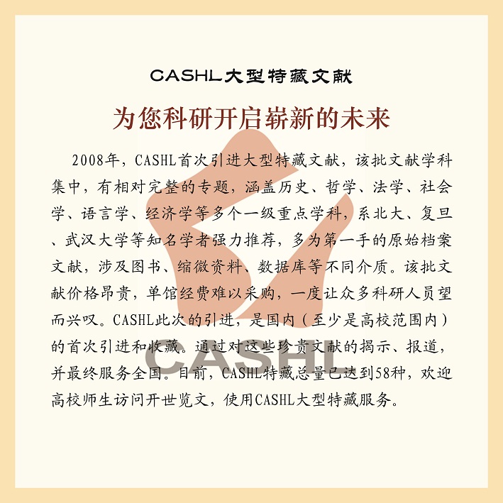 北京市海淀区北京大学图书馆内CASHL管理中心 100871 E-mail: ref@cashl.edu.cn